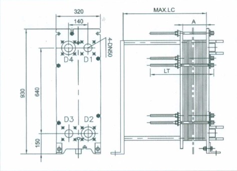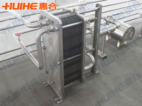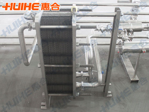 板式換熱器是由固定擋板、板片、移動擋板、立柱、上導軌、下導軌及固定螺栓組成。在固定擋板及移動擋板之間是一系列被固定的板片。每片板片均有墊圈,所以板片間構成相互平行的封閉流道,介質在每兩塊板片之間交替流動。
